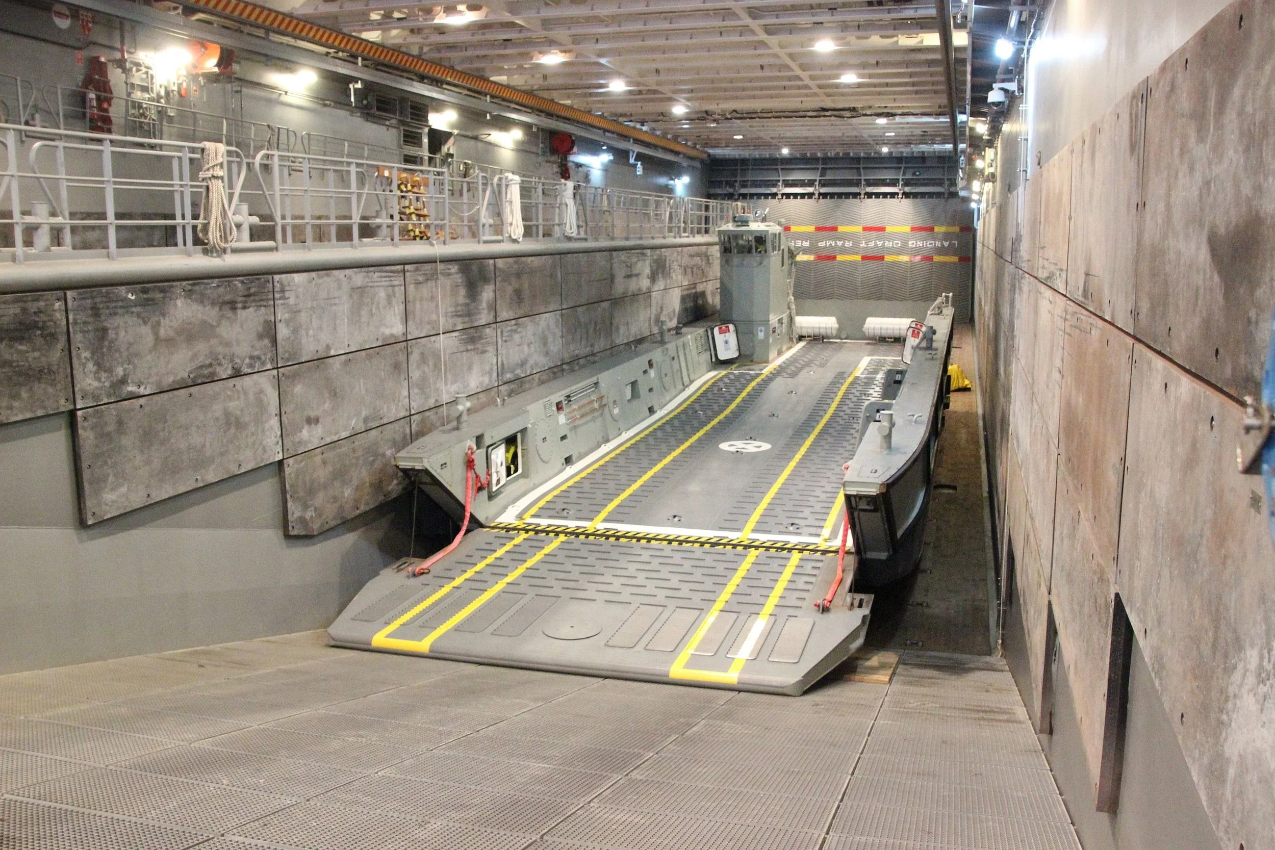 An LCM-1E landing craft on display on the well deck of HMAS Canberra while the ship was open to the public during the 2015 Anzac Day commemorations in Hobart.