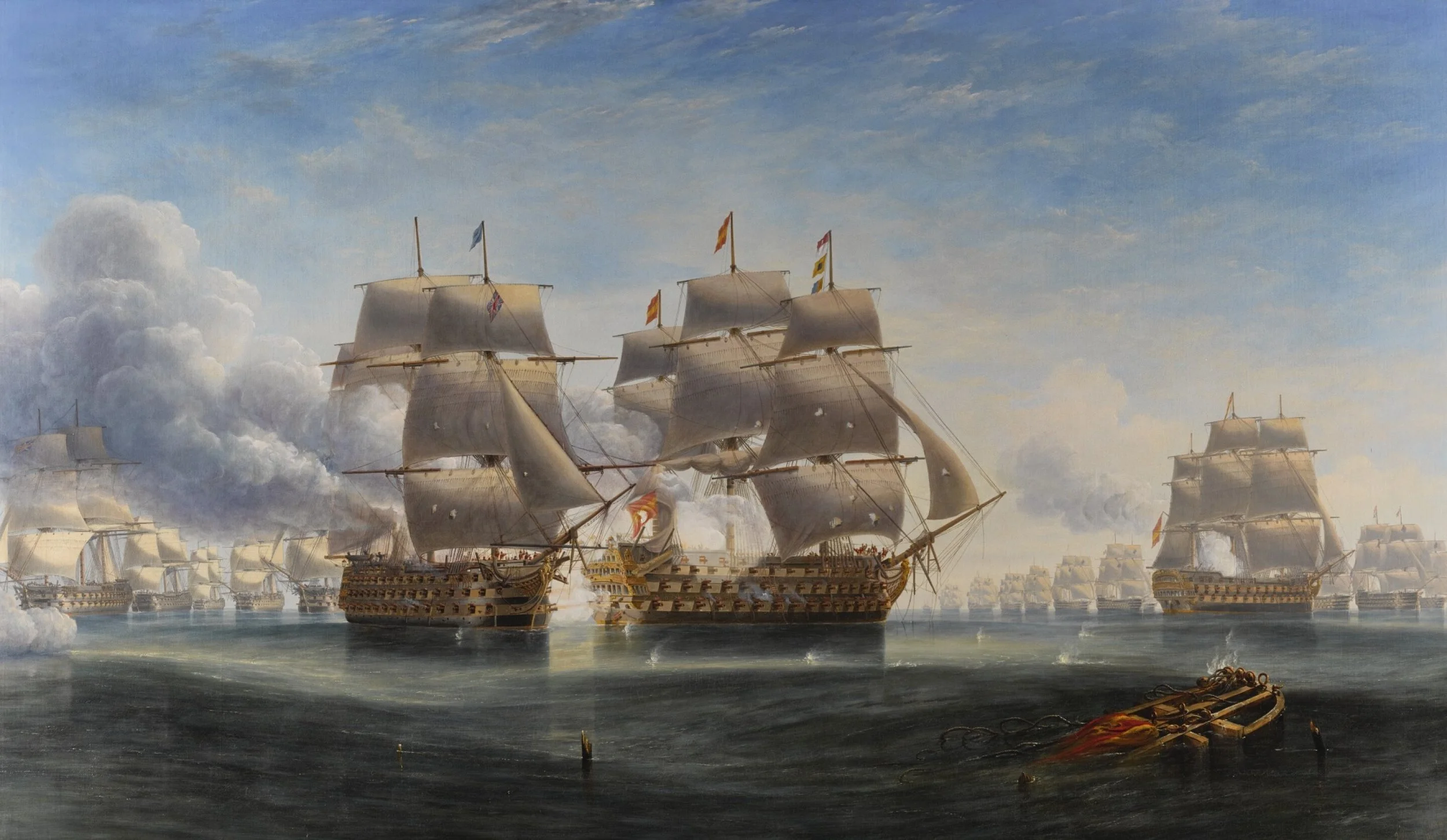 A depiction of the events of 22 October 1805, the day following the Battle of Trafalgar on 21 October 1805, off Cape Trafalgar, Province of CΓ‘diz, Spain. Admiral Lord Nelson's ship H.M.S. Victory is heading towards the shore while H.M.S. Royal Sovereign is being towed by H.M.S. Euryalus. Nicholas Pocock - National Maritime Museum.